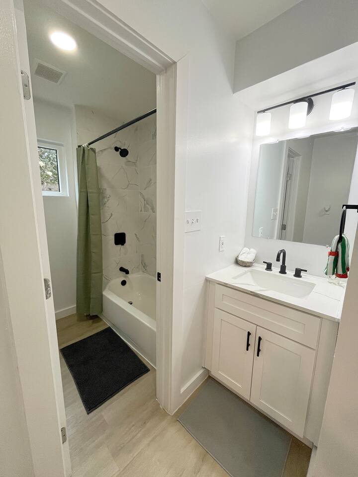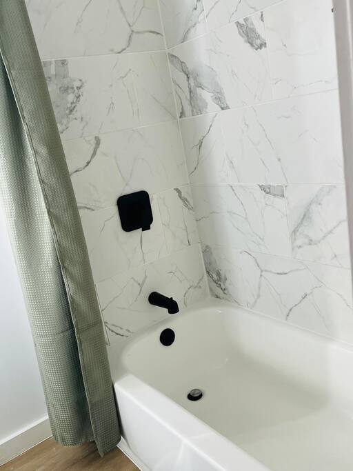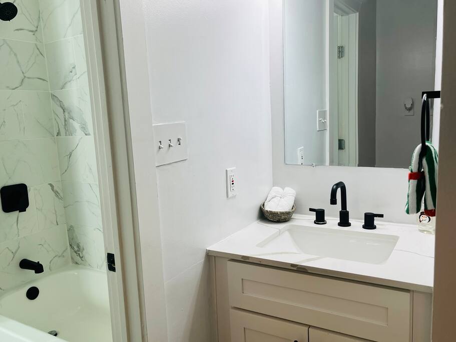 Bath: A clean, modern bathroom stocked with fresh towels, shampoo, conditioner, and body wash.